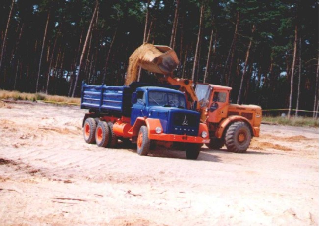 Mit röhrendem Motor belädt der Hanomag B11 von Rudolf Peiffer einen Magirus-Dreiachser 230 D 26 AK. Der erstere wurde in Hannover gebaut, der letztere reiste zur Veranstaltung aus Hannover an.