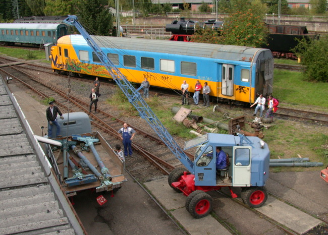 Hier hilft Stefan Materna mit seinem schön restaurierten Fuchs 301 bei der Entladung von historischen Gußteilen - Wasserkranteile und Dachstützen..