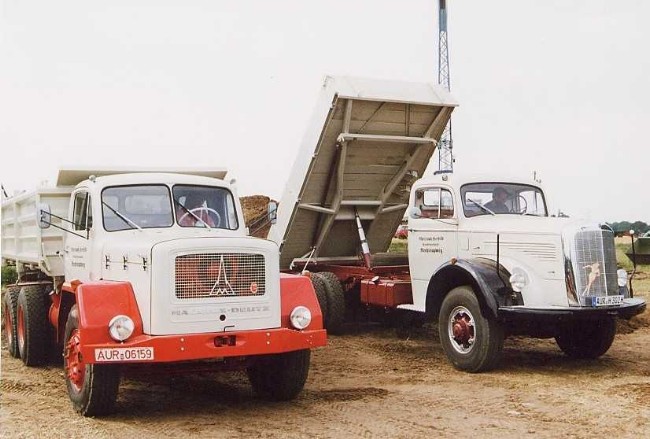 Die beiden eindrucksvollen Haubenkipper Magirus 230 D 26 K 6x4 (Bj. 1970) und Mercedes LAK 315 (Bauj. 1955) des Sammlers Christoph Herfeld treffen sich beim Abkippen.