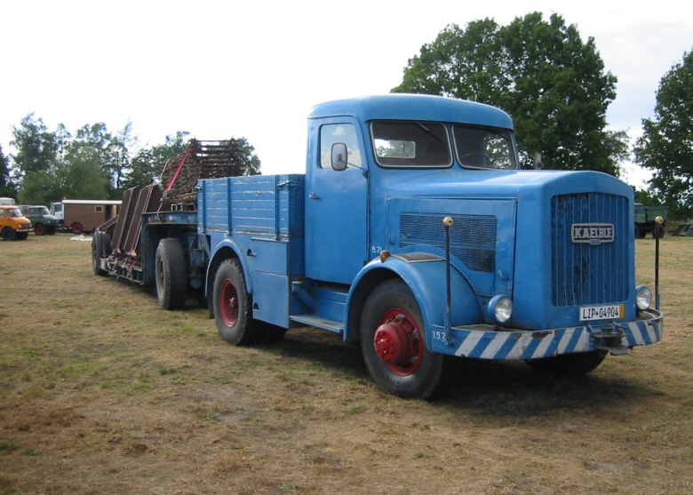 Der LKW-Sammler Sascha Theopold aus Lemgo half den Feldbahnern aus Lage, ihre Bahn aus Eisen mit Fahrzeugen noch ganz aus Eisen zu transportieren. Die Kaelble-Zugmaschine KV 631 ZR 53 singt seit 1953 das sonore Lied der schwäbischen Wertarbeit, besonders wenn ein ebenso alter Tang-Tieflader mit "Riesenluftreifen" dahinter hängt. Stilechter hätte man den Transport nicht durchführen können.