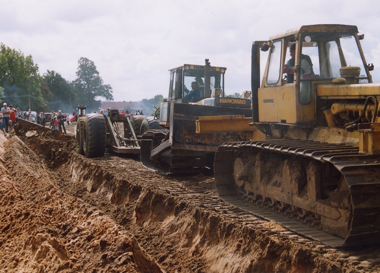 Beim Tiefpflügen mußten dieses Mal zwei Raupen reichen, denen die 1m tiefe Furche aber keine große Mühe bereitete. Immerhin hatte man ja vor zwei Jahren die Stelle schon mal aufgelockert. Wie zuvor sorgte die große alte Hanomag K16 für das Geräusch und einen Großteil der Zugkraft, während die etwas jüngere zwei Hanomag-Raupe den Hydraulikdruck für den Pflug zur Verfügung stellte.
