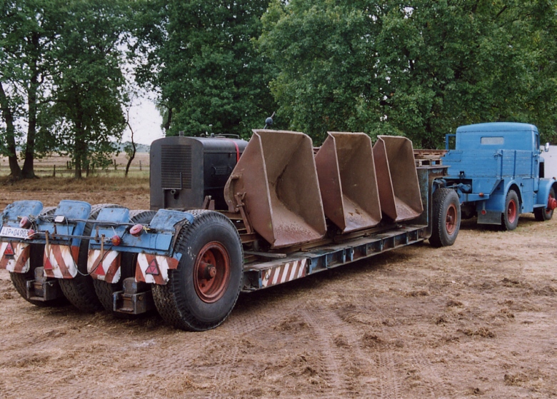 Der 1951 gebaute Tieflader des Herstellers Tang samt historischem Ladegut gab hinter der großen Kaelble ein gutes Bild ab. Hobby-Bedenkenträgern sei gesagt, daß vor Abfahrt die Loren und Gleise natürlich noch mit modernen Spanngurten festgezurrt wurden - auf die historisch korrekte Methode mit jeder Menge Bindedraht sollte man sich heute lieber nicht mehr verlassen.