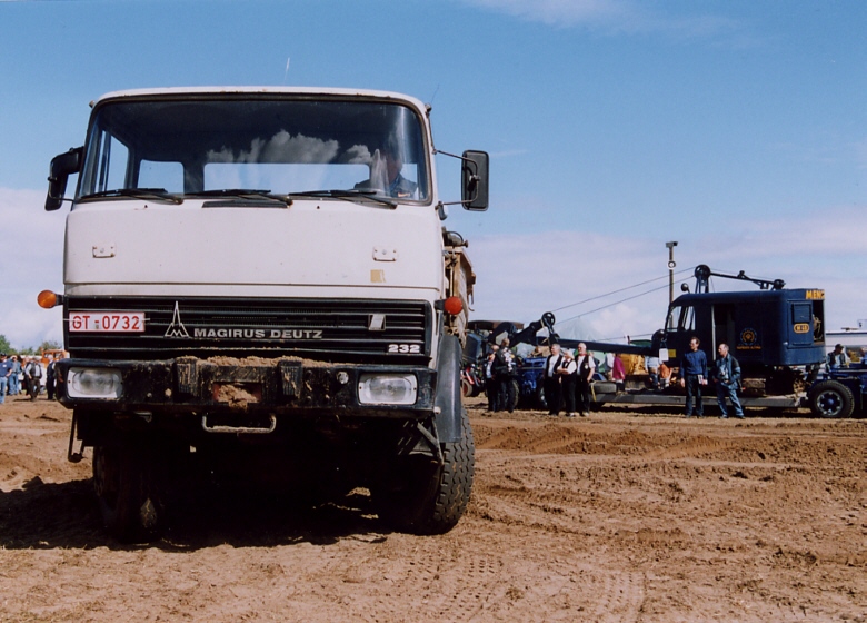 Walter Höcker und sein Sohn Andre aus Versmold verlassen sich bei ihren Transporten gerne auf die Baubullen aus Ulm. Ihr 232 D 16 AK brachte in insgesamt 3 Transporten ihre Maschinen nach Venne und natürlich auch wieder zurück. Auch während der Veranstaltung war man voll des Lobes über das Arbeitstier, das überall durchkam. Geländereste auf der Stoßstange zeugen vom schweren Einsatz auf dem Venner Berg.