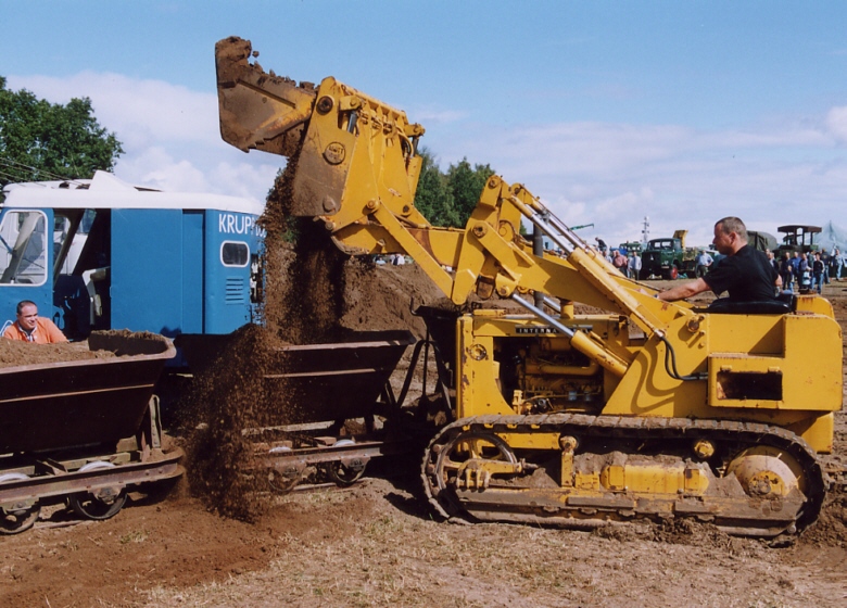 Und noch mal die Klappschaufel der IHC-Raupe: wie beim modernen Steinbruch-Hydraulikbagger wird zum Entleeren einfach das Vorderteil nach oben geklappt. Ein äußerst zielgenaues Abladen wird dadurch möglich -daß bei den kleinen Kipploren doch noch einiges danebengeht, liegt nur an deren schmalen Mulden.