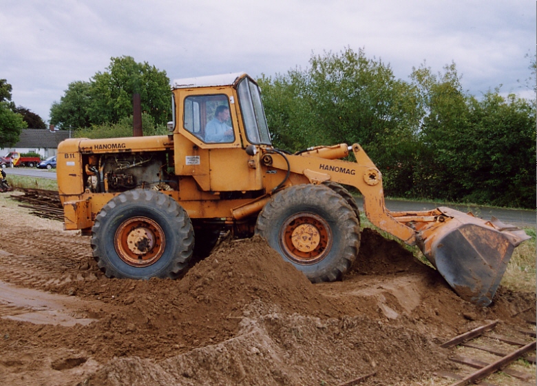 Der B11 aus der Höckerschen Sammlung mit dem Meister persönlich am Kreuzhebel ebnet hier nach Schichtende am Sonntag nachmittag den Kippgraben der Feldbahn wieder ein.