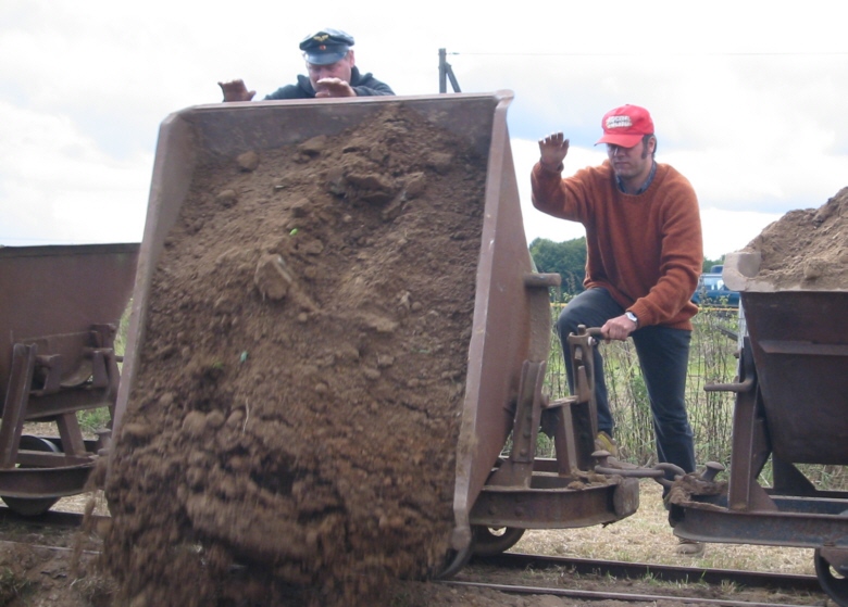 Gerade ist der vom Menck M60-Bagger zielgenau beladene Lorenzug wieder angekommen. Ein kräftiges "Hau-Ruck" von zwei gestandenen Feldbahnern, und schon liegt wieder ein Kubikmeter Heimaterde im Kippgraben. Und bald kommt die Raupe, lädt die Erde auf einen Kipper, der sie dann zum Bagger zurückbringt. Und warum machen die das? Wir wissen es nicht, aber es macht irgendwie Spaß...