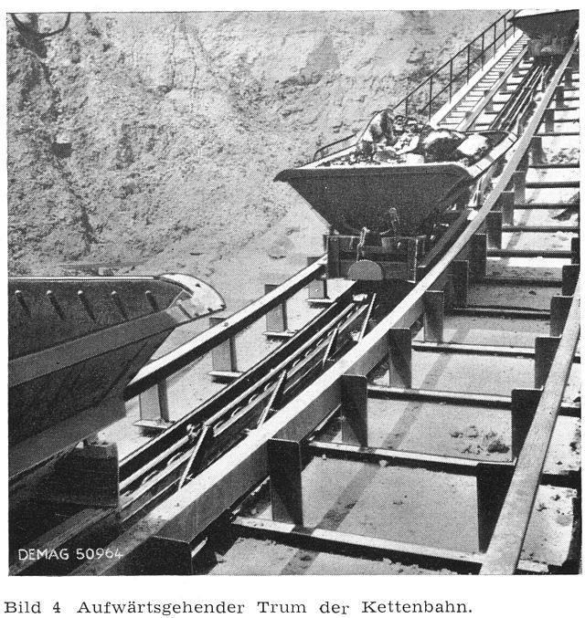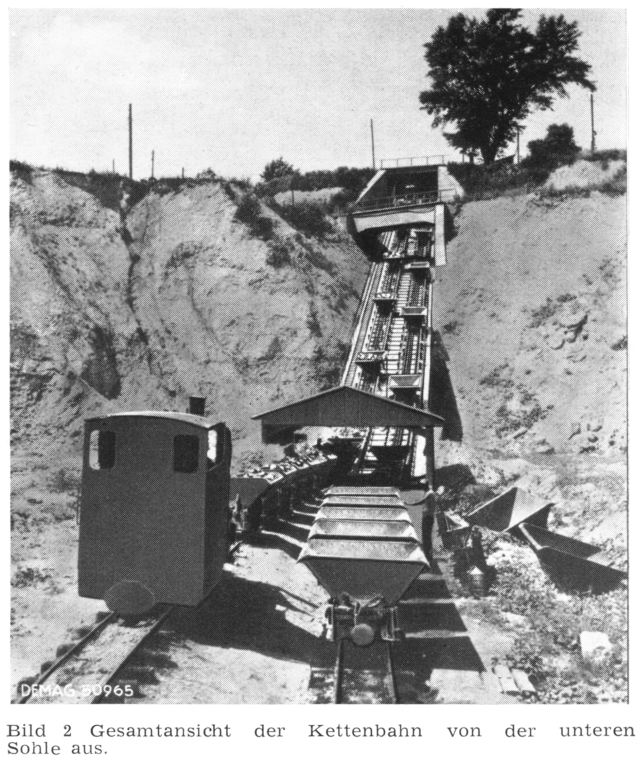 Die von der DEMAG entworfene und ausgeführte Bahn, Bilder 2 bis 5, wurde mit einem Gleismittenabstand von 2250mm gebaut und erhielt entsprechend dem vorhandenen Schienennetz eine Spurweite von 600mm. In den beiden Gleisen läuft eine praktisch endlose Rundgliederkette aus Spezialstahl, die aus 65 Stück Kettenenden besteht. Diese Enden sind Zwischenbügel verbunden, die zur Aufnahme von Stahlrollen dienen, die den Durchhang der Kette vermindern sollen und an denen gleichzeitig klappbare Mitnehmer angebracht sind, die ebenfalls auf Stahlrollen laufen. Die Mitnehmer für das aufwärtsgehende Vollgleis und das abwärtsgehende Leergleis haben die gleiche Ausführung, sind aber in der Kette entgegengesetzt angebracht. Damit wurde erreicht, daß im Vollgleis jeweils eine Lore von einem Mitnehmer zur Ackersohle nach oben gebracht wird, während im Leergleis jeweils eine Lore, von einem Mitnehmer geführt, der Grubensohle zugeführt wird. Die Führung der Kettenenden erfolgt in zwei nebeneinanderliegenden Profilschienen, auf deren Oberfläche die Rollen der Bügel und Mitnehmer laufen.