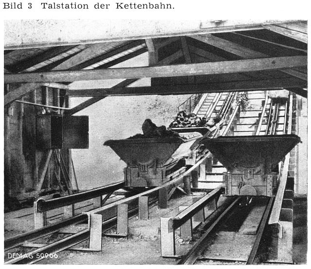 Der Motor mit dem Getriebe und dem Rädervorgelege bildet die am höchsten Punkt der Bahn aufgestellte Antriebsstation. Ein Spannwagen, mit einem Gegengewicht ausgerüstet, sorgt dafür, daß die Förderkette straff gespannt bleibt. Eine ähnliche Spannvorrichtung wurde nachträglich an der Umkehrstelle auf der Bruchsohle eingebaut, um das Stauchen und damit verbundene Verklemmen der Kettenglieder in der Führung zu verhindern. Auf der Bruchsohle laufen die einzelnen beladenen Loren der Kettenbahn mit Hilfe einer handgesteuerten Abteilsperre selbsttätig zu. Auf der Ackersohle werden die leeren Wagen von der Lokomotive im Zugverband bis zur Antriebsstation gebracht, dort entkuppelt und einzeln durch eine selbsttätig arbeitende Abteilsperre dem Leergleis zugeführt. Im Vollgleis für die beladenen Loren sind überfahrbare Haltefallen angebracht, die ein Rücklaufen der Loren bei etwaigen Kettenbrüchen verhndern. Das Entgleisen der Loren auf der zweigleisigen Bahn wird durch seitlich angebrachte Führungen verhindern.