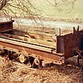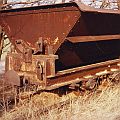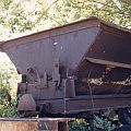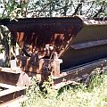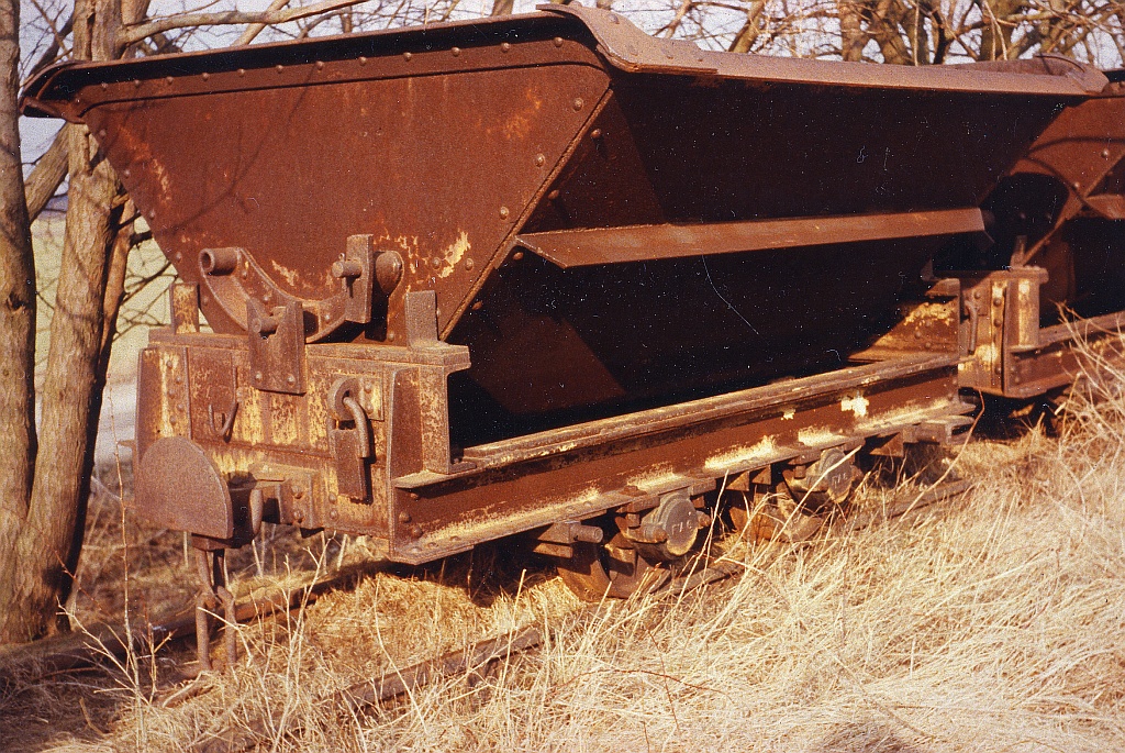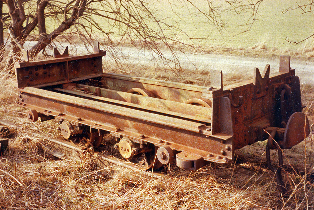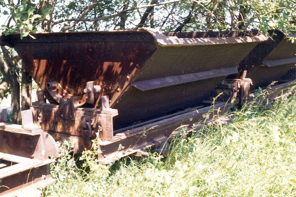 Die Konstruktion der Loren taucht in keiner DIN-Norm auf, ich weiß auch nicht, wer der Hersteller war. Für die Modellbauer sind die Kipploren aber, wie ich meine, sehr interessant, da die Lorenrahmen keinerlei gebogene Teile aufweisen: alles ist aus geraden Profilen zusammengenietet oder geschweißt und sieht auch noch recht gut aus. Die Muldenfeststellung erfolgte recht altertümlich durch sog. Schlemper, das sind Laschen aus Flacheisen, die über einen Dorn an der Mulde gesteckt werden und mit einem Splint gesichert werden. Am Rahmen sind zum Teil noch die Führungsrollen sichtbar, die die Lore auf der Kettenbahnstrecke seitlich und nach oben führten.